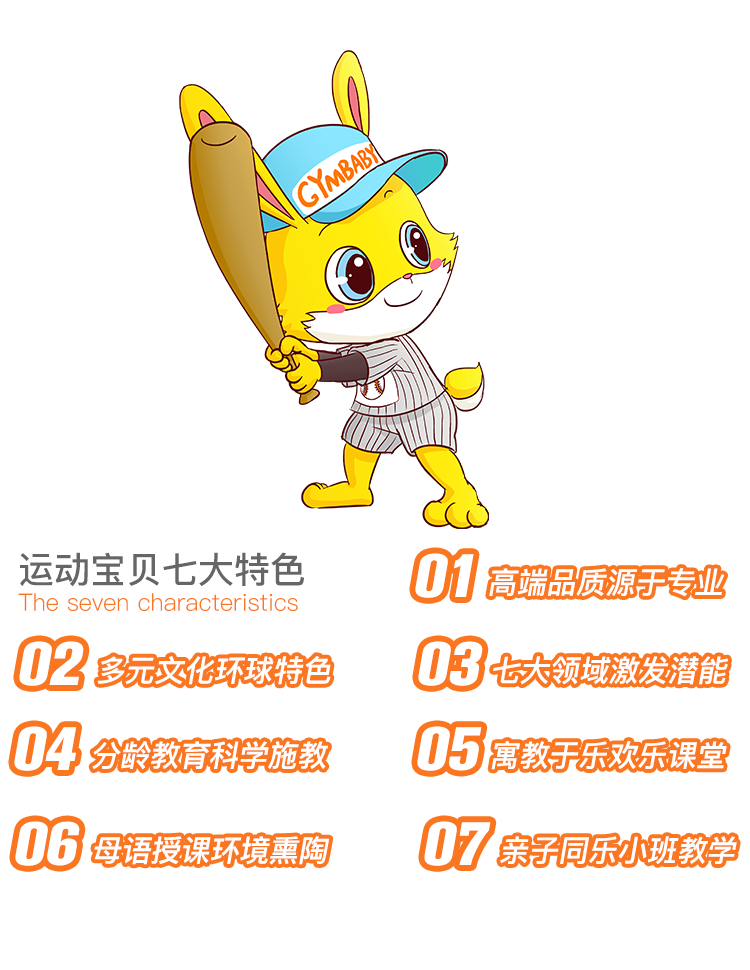 感官教育,体能教育,识别教育,社会教育,人格教育,语言教育, 音乐教育因材施教个体成长是GYMBABY运动宝贝早教机构始终遵循的育教模式,因为我们都知道每个宝宝都是独一无二的,每个宝宝的每个成长阶段都有各不相同的表现, GYMBABY运动宝贝早教机构量身打造的国际化早教课程可以使宝宝根据自身特点和特质,有的放矢的展开各领域训练和刺激,让宝宝易于接受,乐于接受,渴望接受。 轻松愉悦的教学氛围是宝宝学习的前提条件,因此GYMBABY运动宝贝早教机构的课程表达方式灵活、多样。情节丰富的游戏互动,配以音乐、舞蹈、儿歌以及生动形象的道具元素, 使得GYMBABY运动宝贝早教机构的课堂犹如一个巨大的磁场,每分每秒都在吸引着宝宝,无限激发他们的好奇心。挖掘内在潜能。